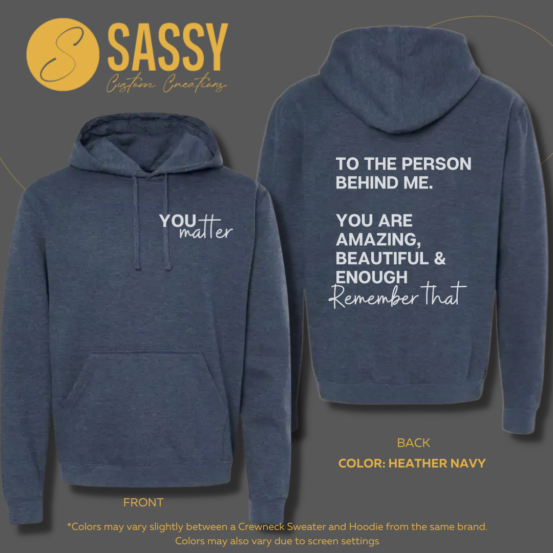 Spread positivity wherever you go with the YOU MATTER - DEAR PERSON BEHIND ME sweater. Its positive messaging is a daily reminder to be kind and prioritize mental health. Because at the end of the day, YOU MATTER, dear person behind me.